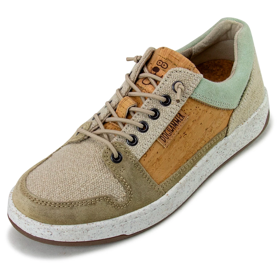 The upper consists of a cotton material blend that is robust and durable. The shoes are water-repellent and reliably tear-resistant. The soft lining makes them very comfortable to wear. The temperature is pleasantly regulated so that the feet neither sweat nor freeze. The development of unpleasant odours is also prevented. The insole made of recycled cork is also especially comfortable, with a low weight and feeling soft to wear. The rubber outsole guarantees good traction in any terrain. Leather reinforcements on the toes enhance protection. The heel area is slightly rounded for a natural gait cycle. The casual elastic lacing allows you to slip into the shoes quickly. A capable partner casually activities!